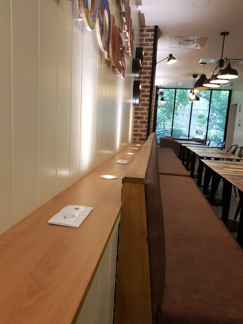 Pour les Copains Toqués, AJG Menuiserie a réalisé l’ensemble de l’agencement avant et arrière, en mêlant le bois et le corian pour un ensemble chaleureux et original aux pieds des tours de La Défense.