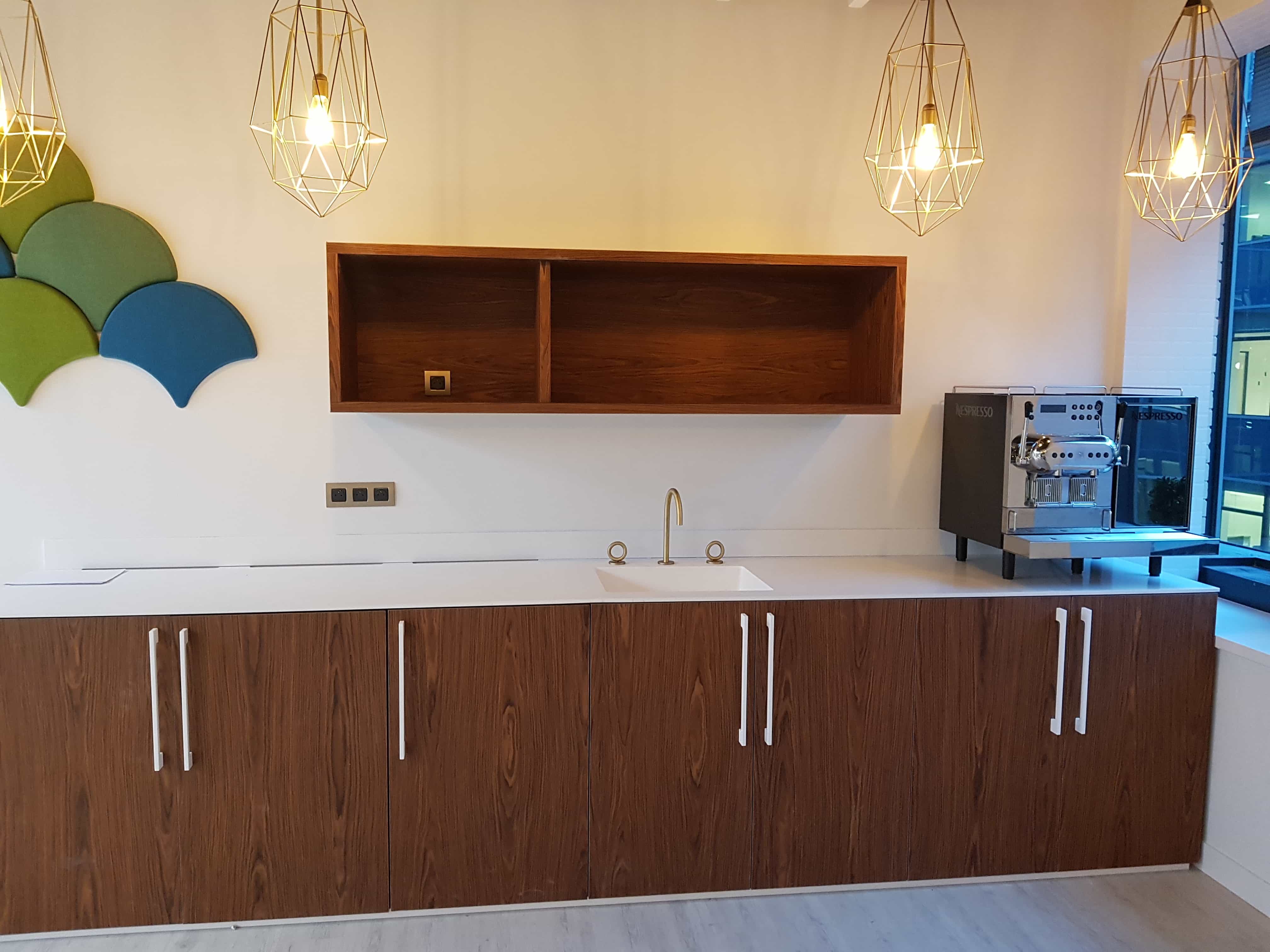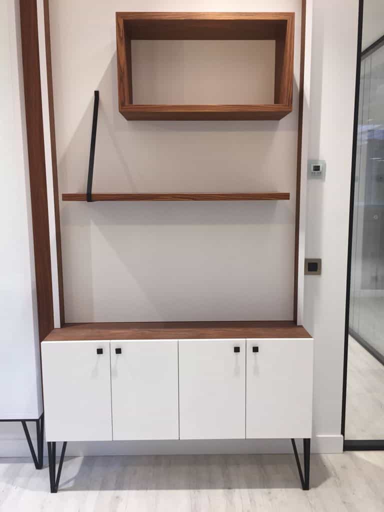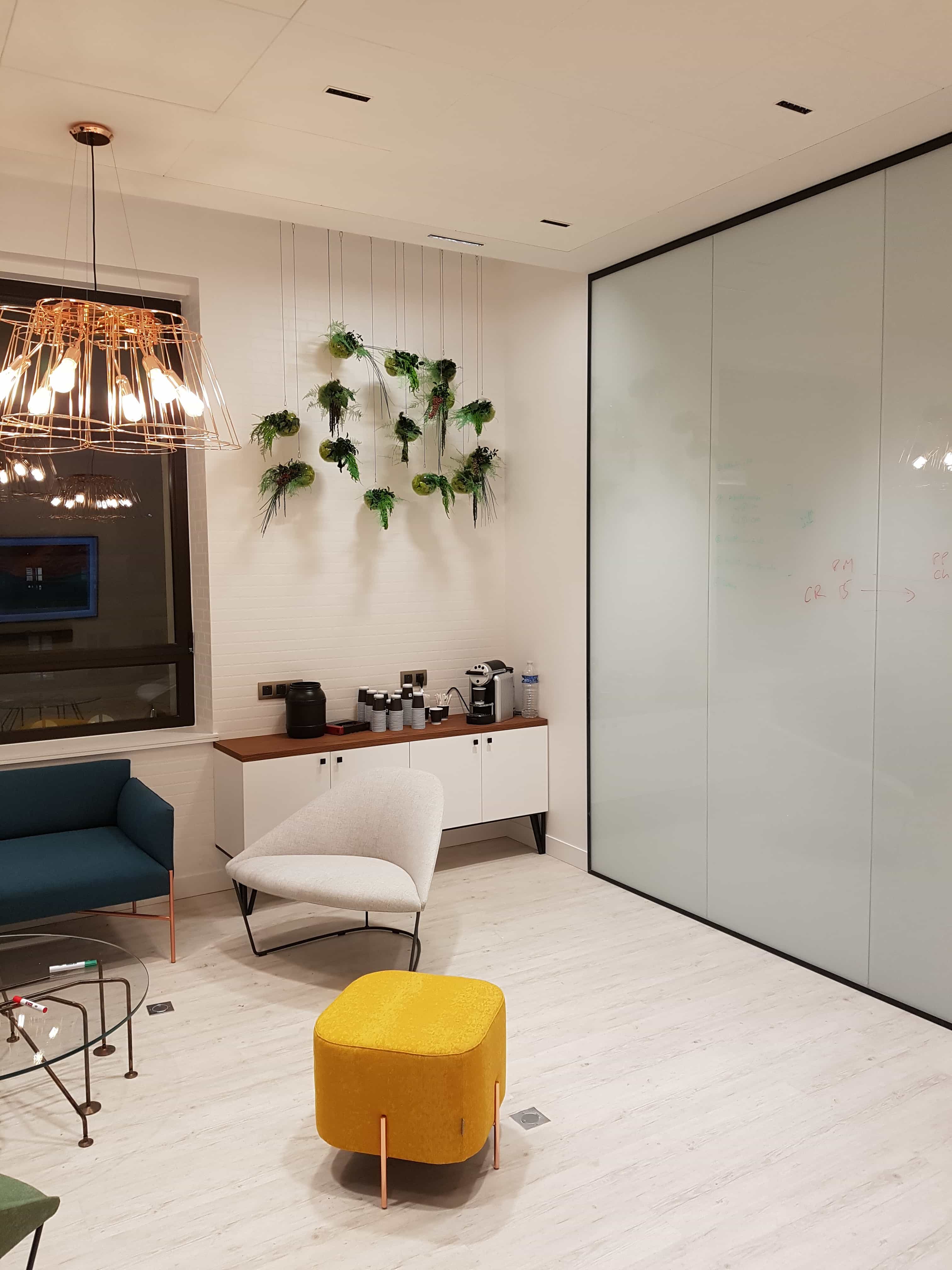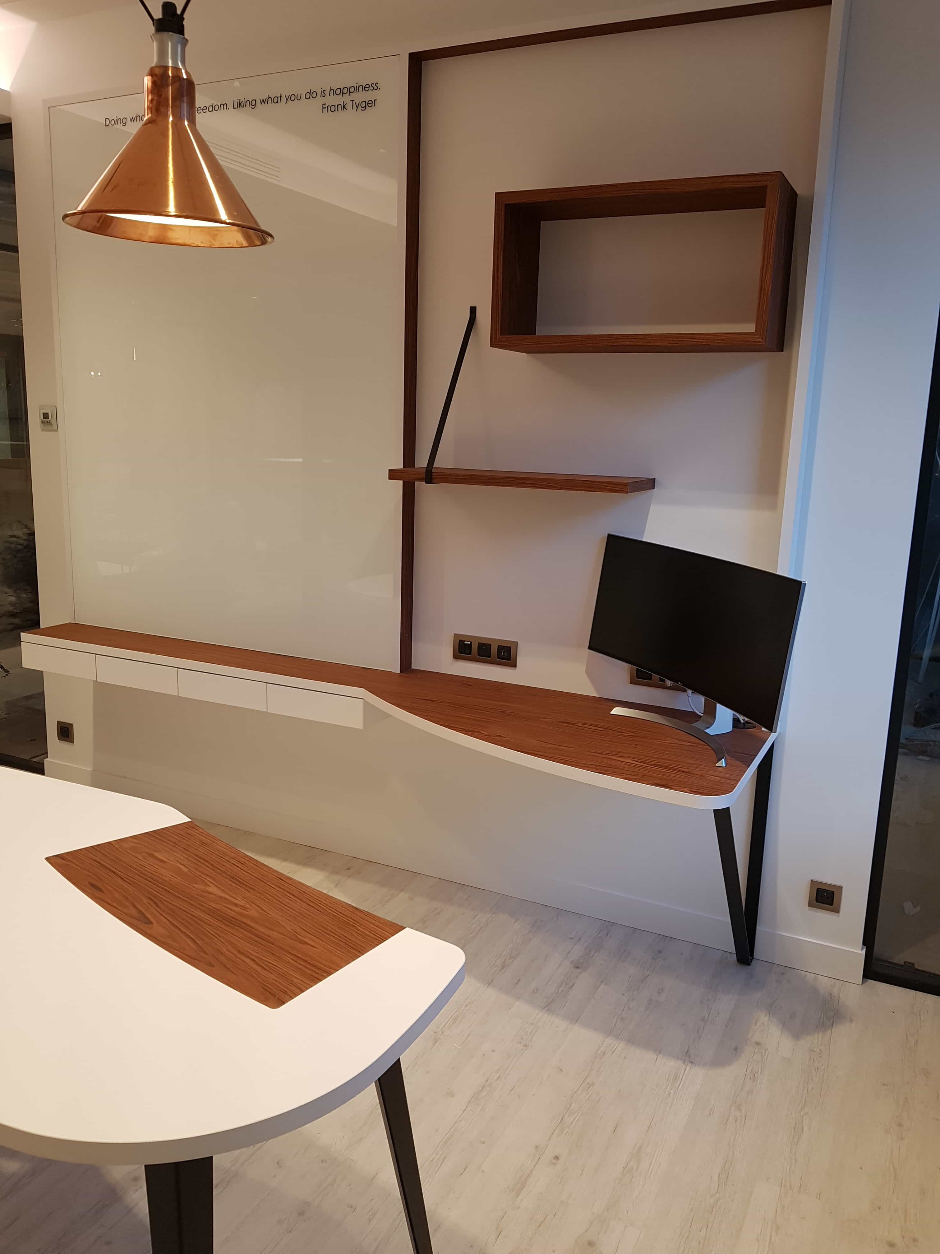 Conçu autour de 4 matériaux clés – le Hubler bois, le blanc extra mat, le métal laqué et le verre laqué extra-blanc – les meubles suspendus ou posés fondent une esthétique générale douce, raffinée et décidément élégante. Combinés à la résine, utilisée jusque dans les poignées et au travail du métal et à la laque, ces matériaux donnent vie à un espace de travail agréable et ouvert, qui accueille la verdure aussi bien que la haute technologie.